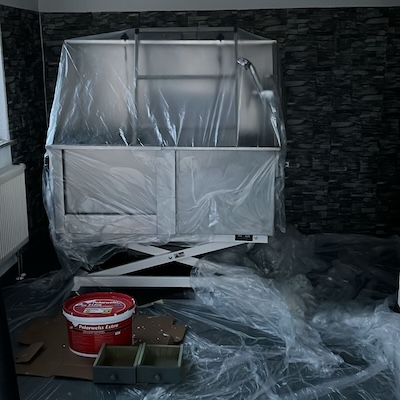Der eben noch leere Raum wird umgebaut. Ein Wasseranschluss muss her, die Elektrik muss neu gemacht werden und wir Malern und Tapezieren.